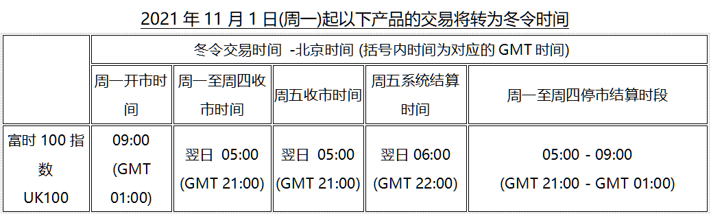因应欧洲时区于2021年11月1日(周一)及美国时区于2021年11月8日(周一)开始分别转为冬令时间, 本公司各产品交易时间将调整为冬令时间,敬请留意。